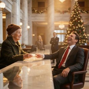 I Just Want to Check My Balance,” the 90-Year-Old Woman Said — The Banker Smirked… Until the Truth Silenced the Room “I just want to check my balance.” The elderly woman’s voice was soft, slightly unsteady—but clear enough to carry across the gleaming marble lobby of First National Bank. A few conversations slowed. Some people glanced over. Others looked irritated. Somewhere nearby, someone let out a quiet, dismissive laugh. At the center of the room stood Daniel Whitmore, the bank’s president. At fifty-two, dressed in an impeccably tailored suit worth more than most people’s monthly rent, he carried himself with quiet authority—as if the entire building answered to him. When he heard her, he laughed. Not kindly. Not politely. Sharply. Daniel was used to dealing with high-profile clients—executives, investors, people who spoke in measured tones and wore luxury watches. To him, the elderly woman standing near the counter looked out of place. Like she didn’t belong. “Ma’am,” he said loudly, making sure others could hear, “you might be in the wrong place. This is a private institution. There’s a local branch down the street that would be more appropriate.” The woman—Evelyn Carter—rested both hands on her worn cane. She didn’t move. Her coat was simple. Her shoes scuffed from years of use. But her eyes were steady. “Young man,” she replied calmly, pulling a black card from her pocket, “I asked to check my balance. Not for directions.” No frustration. No pleading. Just quiet confidence. Daniel glanced at the card with obvious skepticism. The edges were worn, the numbers barely visible. To him, it looked fake. “Emily,” he called to his assistant, raising his voice, “it seems we have someone attempting to use a counterfeit card.” A few well-dressed clients chuckled under their breath. Evelyn remained still. If anyone had looked closely, they might have noticed something in her expression—something firm, something earned through years of being underestimated. Emily stepped closer, lowering her voice. “Sir, we could just verify it in the system. It’ll only take a moment.” “No,” Daniel said flatly. “I’m not wasting time on this.” He dismissed her with a wave. And then— Evelyn smiled. Not nervously. Not awkwardly. A calm, knowing smile. The kind that made people uneasy without understanding why. For a split second, Daniel felt something tighten in his chest. A warning. He ignored it. Two security guards approached, hesitant. “Ma’am,” one said gently, “we’ve been asked to escort you outside.” Evelyn’s gaze sharpened. She had lived through another era—she understood exactly what being “escorted out” could mean. “I didn’t say I was leaving,” she replied quietly. “I said I wanted to check my balance.” Daniel laughed again, louder this time. “This is why we have security,” he said, addressing the room. “People misunderstanding services they clearly don’t belong using.” What he didn’t realize… was that in just a few moments, the entire room would fall silent—for a very different reason…C0ntinues