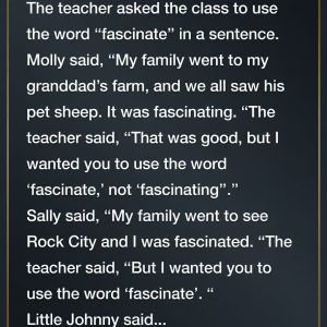 During a classroom lesson, a teacher asked her students to use the word “fascinate” in a sentence. Molly eagerly raised her hand and said, “My family went…