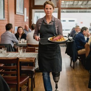 Every shift at the bistro began the same way for Alex—quiet determination, practiced resilience, and the steady rhythm of her prosthetic against the polished floor. Click, thud….