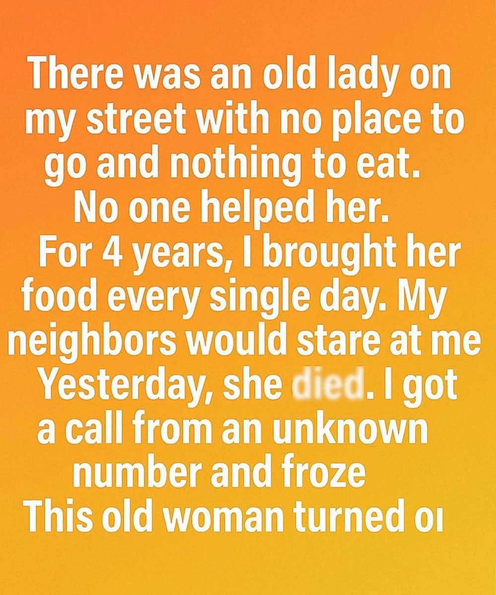 What began as an act of kindness became a ritual that nourished me as much as it did her. Yesterday, she d:ied.