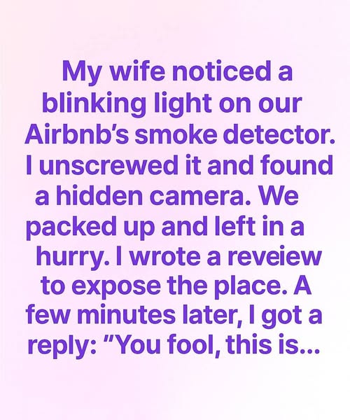 While staying at an Airbnb, my wife noticed a blinking light on the smoke detector. When I checked, I found a tiny hidden camera inside. Heart pounding, we packed up and fled. Later, the host claimed it was a security system transmitter — but a red laser dot in a photo revealed a tracker.