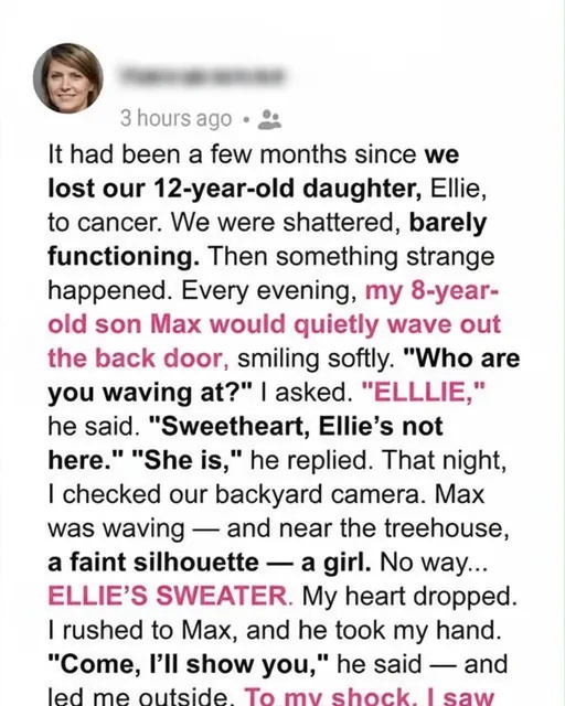 The next evening, I followed Max outside and discovered the truth. The figure was Ava, Ellie’s best friend, who had been secretly visiting to comfort Max, honoring a promise she made to Ellie. She wore the sweater Ellie had gifted her and waved back to remind Max he wasn’t alone. Since then, our family gathers by the treehouse each evening, sharing memories, healing slowly. Max still waves at sunset—and now, I gently wave too.