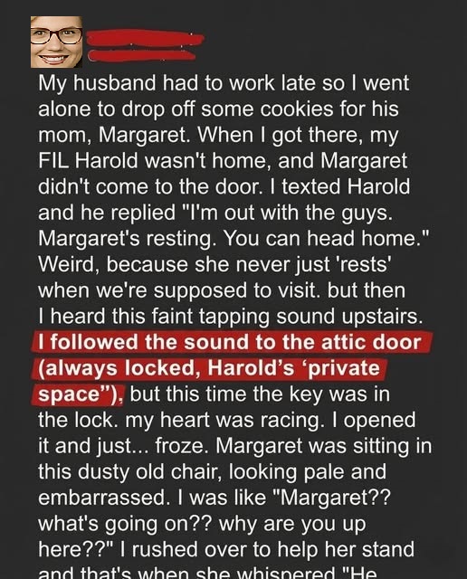 When I texted my father-in-law, Harold, he replied casually that he was out and Margaret was “resting.” The word didn’t sit right. As I moved through the house, I heard a faint tapping from upstairs. My heart raced as I followed the sound to the hallway—and then to the attic. The door was unlocked, something I’d never seen before. Inside, Margaret sat stiffly on a wooden chair, pale and shaken. When she saw me, relief flooded her face.
