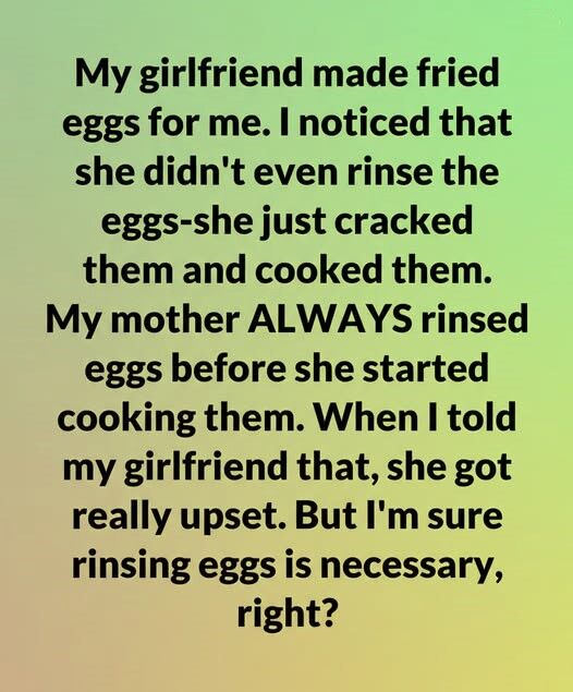 That evening, they cooked together, laughing about the strange power of inherited rituals. They cracked the eggs without rinsing them. Because sometimes, it’s not about eggs—it’s about building new rituals together, shaped by understanding, not the past.