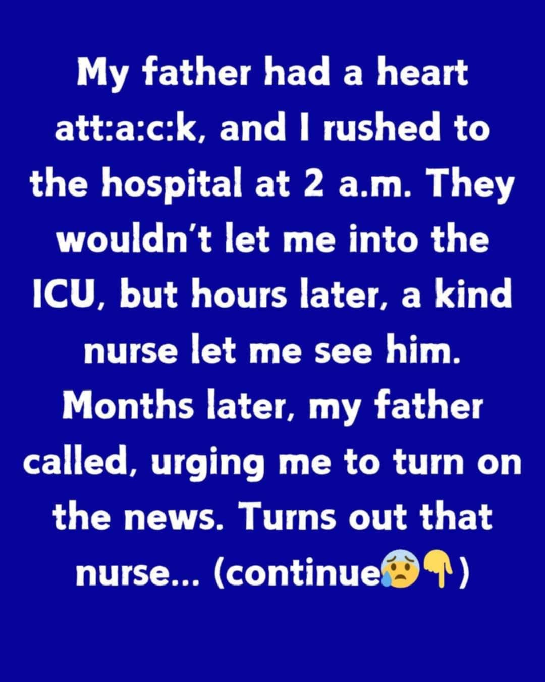 My father had a heart atta:ck, and I rushed to the hospital at 2 a.m. They wouldn’t let me into the ICU, but hours later, a kind nurse let me see him. Months later, my father called, urging me to turn on the news. Turns out that the nurse wasn’t a nurse at all.