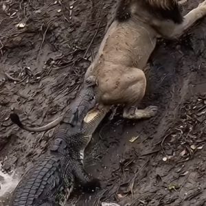 On the muddy riverbank, the struggle for survival unfolds in its rawest form. A powerful crocodile surges from the churning water, its jaws locked in an unyielding…