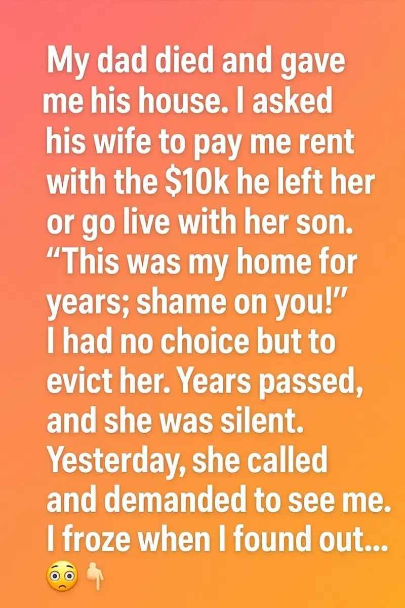 After my father died and left me his house, I asked his wife to either pay rent using the money he had left her or move in with her son. She refused, saying it had been her home for years, so I eventually made her leave. We lost contact, and I renovated the house, building a new life there, though a quiet guilt always lingered in my mind.
