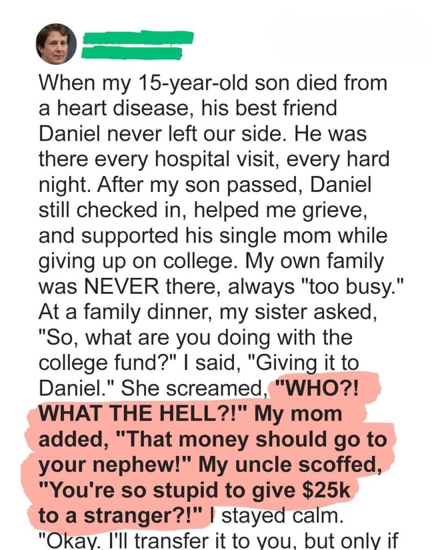 After losing my 15-year-old son Ben to a lifelong heart condition, I was consumed by grief. In his final days, he asked me to give his $25,000 college fund to Daniel, his best friend who never missed a hospital visit. I promised, never thinking I would truly have to follow through.