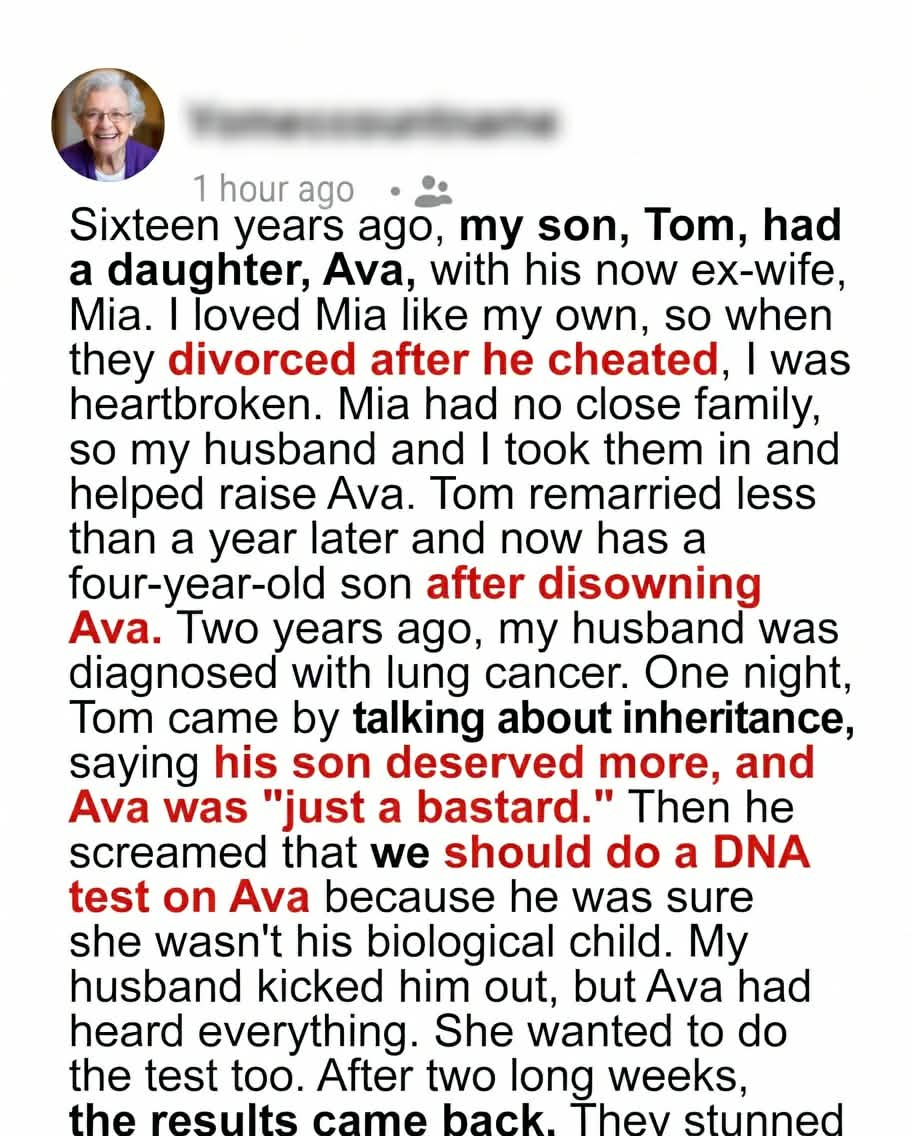 When my son, Tom, walked away from his daughter Ava, my husband Gary and I didn’t hesitate to step in. Sixteen years later, his sudden request for a DNA test changed everything.Years ago, Tom married Mia, a wonderful young woman I adored. When Ava was born, life seemed perfect — until Tom made choices that hurt their marriage. Mia showed up at our doorstep one rainy night, heartbroken, with baby Ava in her arms. From that moment, we promised to help raise Ava in a loving, stable home.