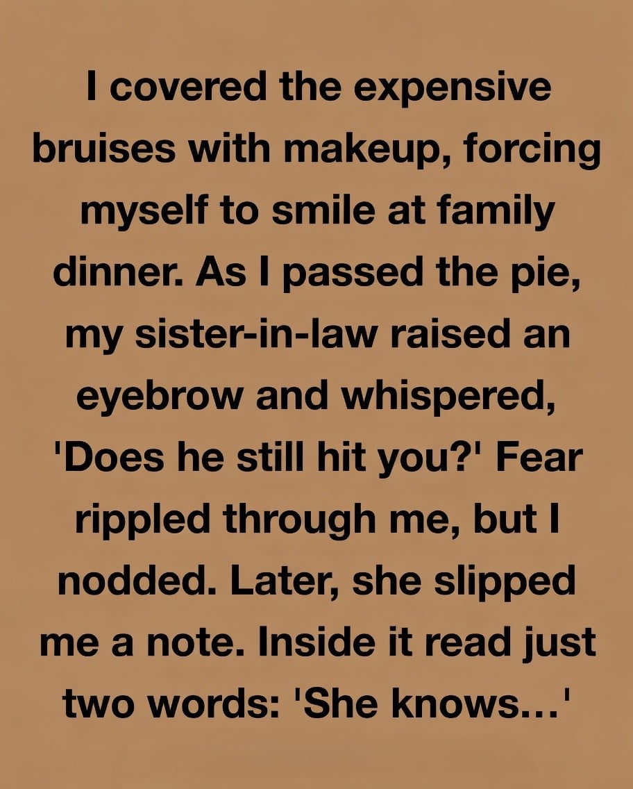 I hid the bruises beneath careful layers of makeup and forced a smile as I sat at the family dinner table. When I passed the pie, my sister-in-law leaned closer and quietly asked, “Does he still hit you?” Fear rushed through me, but I gave a small nod. Later, as everyone moved around the kitchen, she slipped a folded note into my hand. When I opened it, I saw only two words: “She knows…” Those words sent a chill through me, but they also sparked a small, fragile sense of relief that someone else finally understood the pain I had hidden for years.