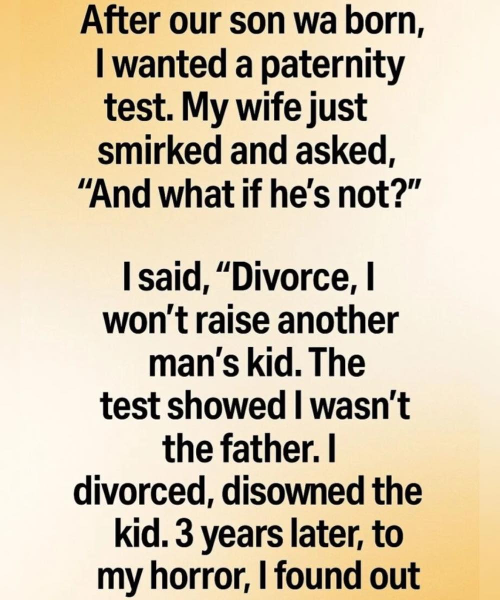 A few days later, the results arrived. My worst fear was confirmed: the child was supposedly not mine. Without hesitation, I filed for divorce, severing ties with my wife and abandoning the boy I had once loved. For three years, I convinced myself I had done the right thing—until an old family friend revealed a truth that shook me to my core: my wife had never cheated, and the first test might have been wrong.