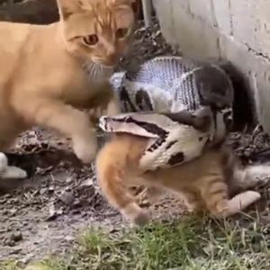 In a quiet backyard corner, danger struck without warning. A massive python, its scales glistening, coiled around a tiny, helpless orange kitten, squeezing the life from the…