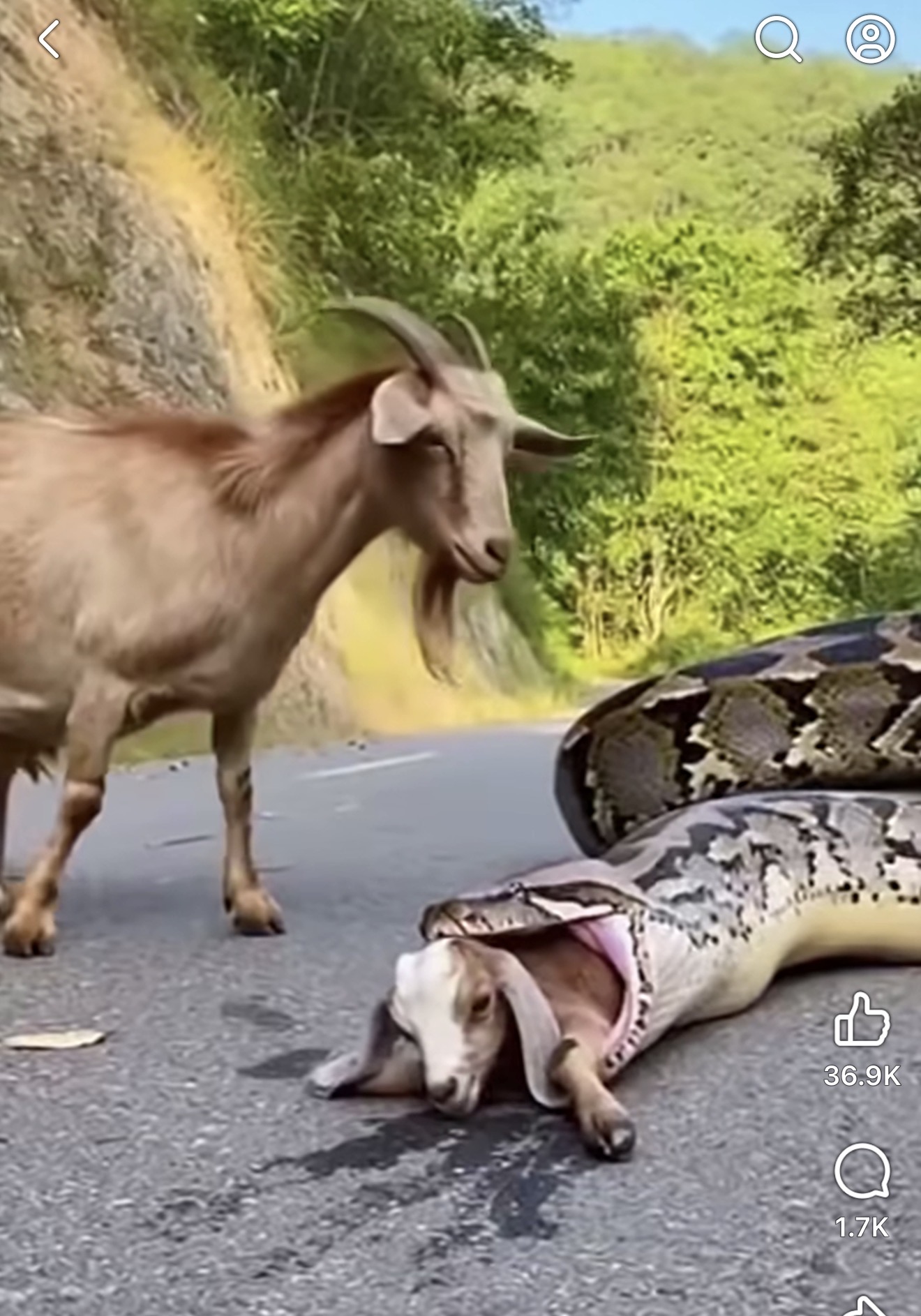 A dramatic wildlife moment was captured on a quiet mountain road when a massive python was seen swallowing a goat whole while another goat stood nearby watching.